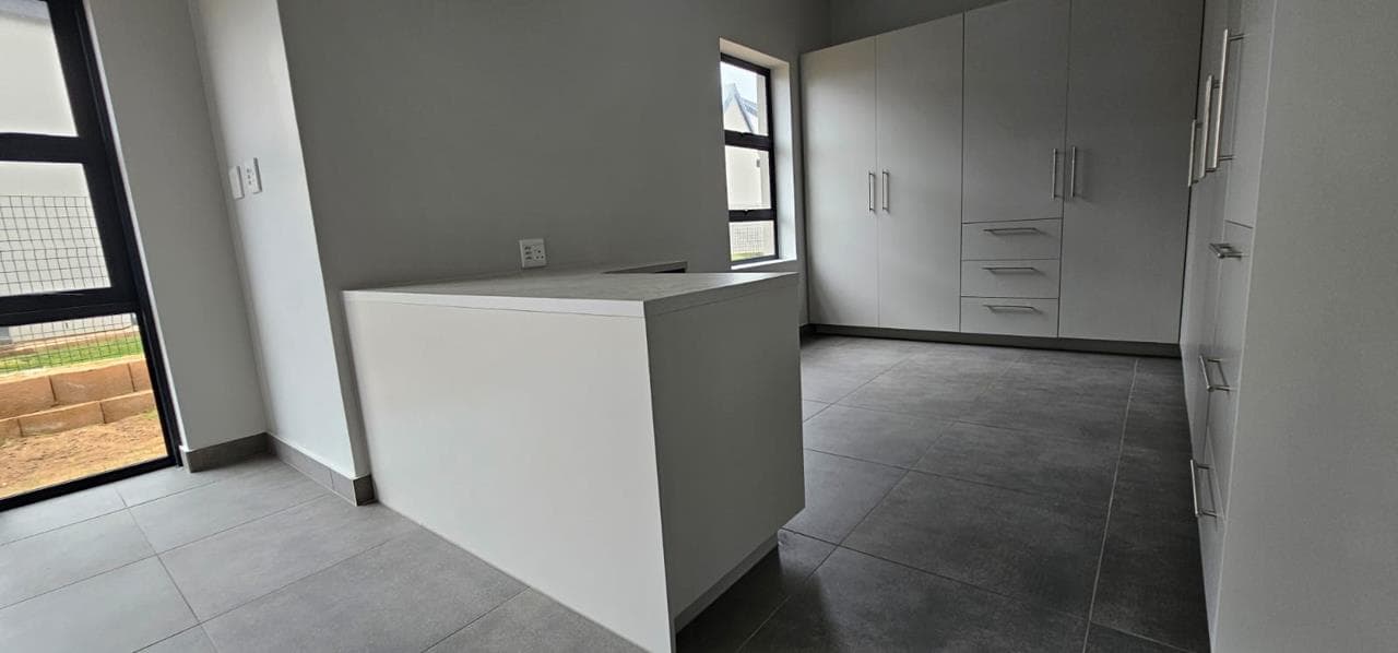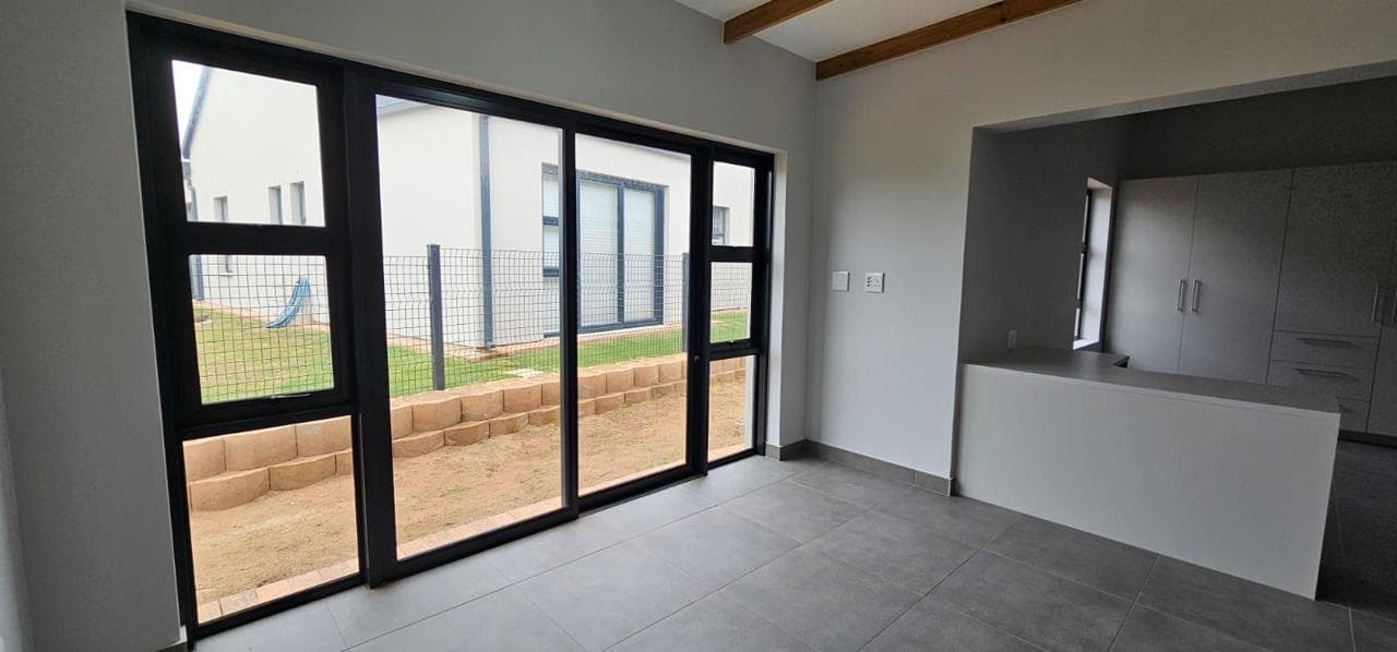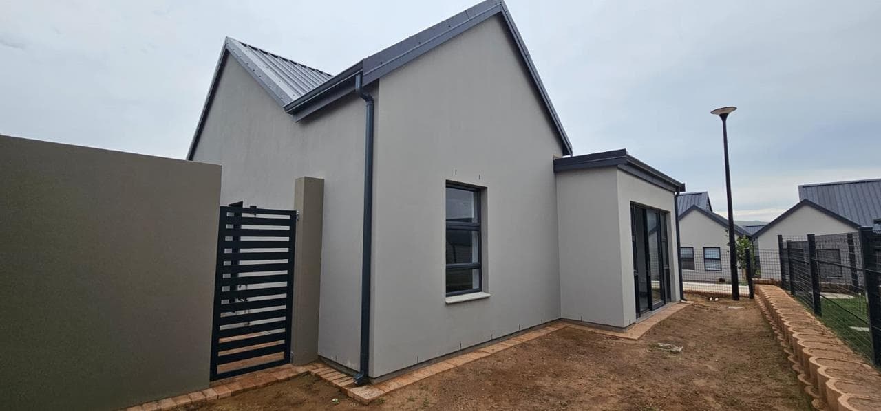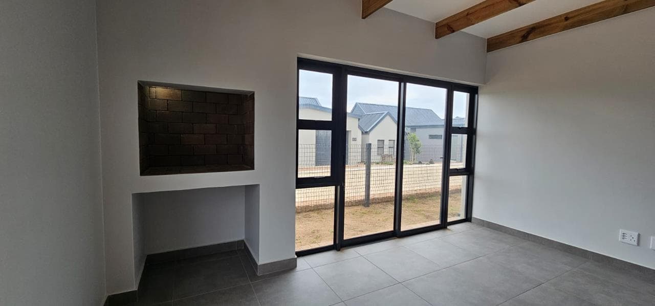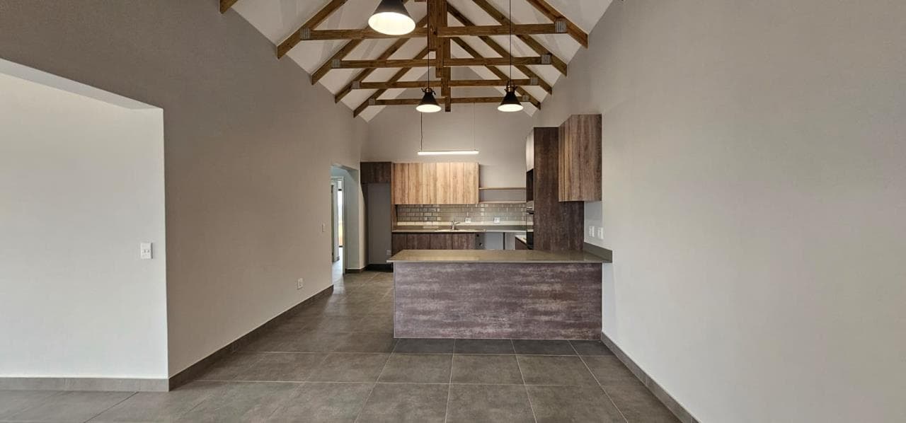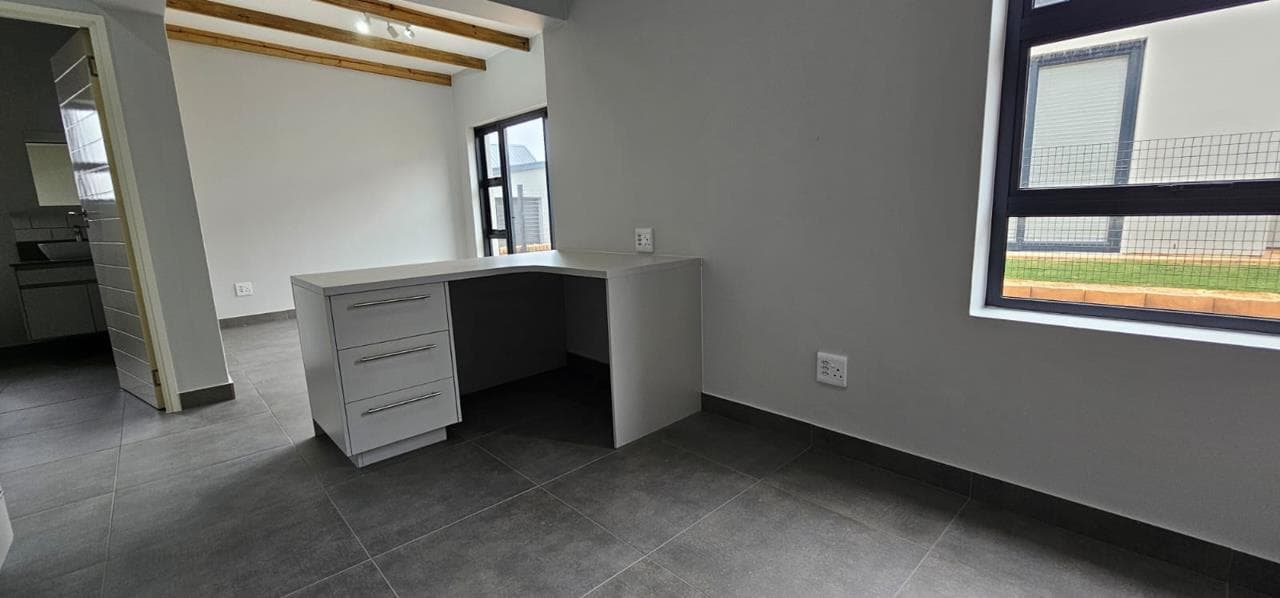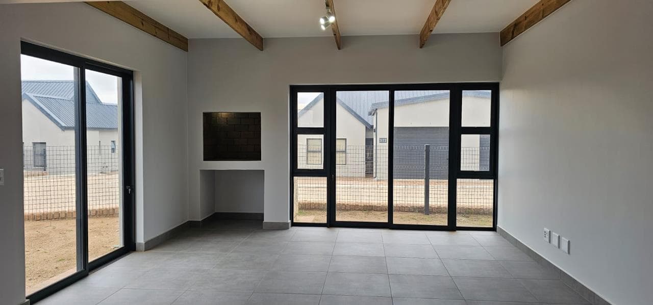 Discover your dream home in this stunning brand new property, designed to offer both style and comfort. The large open plan living area is a standout feature, boasting an abundance of natural light and striking open trusses. A built-in braai is a bonus in the living area! The modern, tiled floors provide a sleek and clean aesthetic throughout the unit, with blinds to be fitted for added privacy and convenience. This property features two spacious bedrooms, with the main bedroom offering extra space and a fitted office area, perfect for those who work from home. Both bedrooms include generous double cupboards for ample storage. The en suite bathroom in the main bedroom is a luxurious retreat, complete with a large walk-in shower. Convenience is key with a single automated garage and additional parking space available in front. Enjoy direct access from the garage to...